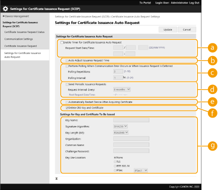Nastavenia nie je možné aktualizovať, keď je vybraná položka [Enable Timer for Certificate Issuance Auto Request]. Žiadosť o vydanie certifikátu v určenom čase