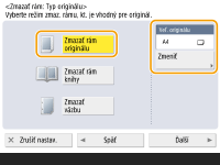Ak sa formát zobrazený v poli <Veľ. originálu> líši od formátu knihy, stlačte tlačidlo <Zmeniť> a vyberte formát. Skenovať sa dajú iba originálne veľkosti zobrazené na displeji dotykového panela.