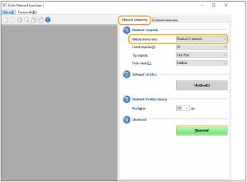 Môžete špecifikovať farbu, rozlíšenie a formát originálu na účely skenovania. Po kliknutí na kartu [Rozšírené nastavenia] môžete vykonávať podrobné nastavenia, napríklad meniť orientáciu originálu. Ďalšie informácie nájdete v pomocníkovi k ovládaču Color Network ScanGear 2.