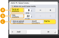 <Akcia po uplynutí doby vyzváňania>: <Ukončiť komunikáciu>, <Prijať fax>