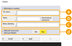 Príklad: Ak je názov domény Windows „priklad“ a meno používateľa v systéme Windows je „pouzivatel1“, zadajte „priklad\pouzivatel1“. Ak používate systém Lotus Notes Domino, zadajte identifikačné meno overeného používateľa (dn), napr. „cn=pouzivatel1,ou=tim1,ou=predajneodd,o=canon“.