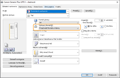 Zadajte rovnakú veľkosť papiera, na ktorý sa má tlačiť, ako je [Výstup. veľkosť] v ovládači tlačiarne.