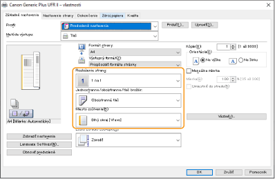 Počas kontroly náhľadu tlače nastavte položku [Rozloženie strany] [Poradie strán] [Jednostranne/obojstranne/tlač brožúr] [Miesto zošívania].