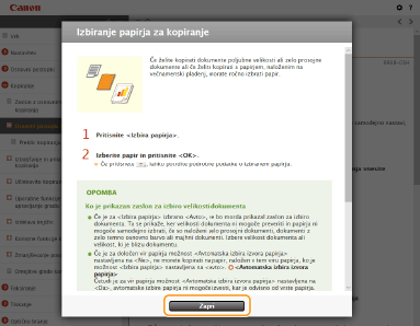 Ko kliknete ikono, lahko trenutna stran postane temna in se prikaže pojavno okno. Če se želite vrniti na stran, v pojavnem oknu kliknite [Zapri].
