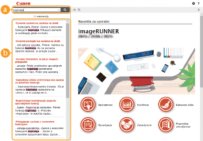 Prikaže rezultate iskanja na vseh straneh, ki vsebujejo vnesene ključne besede. Med temi rezultati lahko najdete želeno stran, tako da kliknete naslov teme.