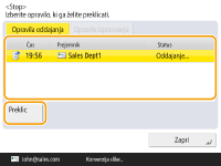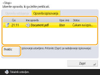 (Ustavi) in se prikaže zaslon, ki vodi v <Opravila oddajanja>/<Opravila izpisovanja>, se opravilo pošiljanja/tiskanja v teku zaustavi in se prikaže <Opravila oddajanja>/<Opravila izpisovanja>.