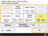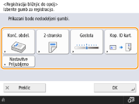 Registracija v <Nastavitve Priljubljeno>V <Nastavitve Priljubljeno> lahko registrirate pogosto uporabljene postopke kopiranja ter pogosto določene cilje in nastavitve za optično branje. Za dodatne informacije glejte Registriranje kombinacije pogosto uporabljenih funkcij.