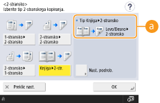 Izvirnik z dvema sosednjima stranema, kot so knjige in revije, lahko kopirate v ločene strani tako, da jih razdelite na levo in desno stran. Ustvarite lahko tudi 2-stranske kopije, tako da desno stran kopirate na sprednjo stran, levo stran pa na zadnjo stran.