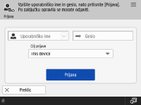 Uporabniki se s tem načinom prijavijo tako, da vnesejo uporabniško ime in geslo s tipkovnico na nadzorni plošči. Ta način je na voljo ne glede na napravo za preverjanje pristnosti.