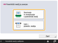 Če je možnost <Izbira možnosti pri povezavi pomnilniškega medija> nastavljena na <Da>, se pri priklopu pomnilniškega medija prikažejo bližnjice do ustreznih funkcij. <Izbira možnosti pri povezavi pomnilniškega medija>