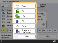 Du kan registrera en mottagares faxnummer eller e-postadress som kan användas för att skicka scannade dokument i adressboken. Du kan också registrera en I-faxmottagare, en filservermålmapp (IP-adress och sökväg) och lagringsplats (Avancerat utrymme) för en Canon flerfunktionsskrivare i adressboken som mottagare.