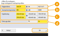 Ställ in mottagningsvillkoren enligt specifikationerna för mottagarens maskin. Det kan inträffa överföringsfel om du ställer in villkor som inte kan hanteras av mottagarens maskin.