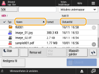Om det finns flera jobb/filer i en lista kan du sortera listan genom att trycka på <Namn> eller <Datum/tid>. Om