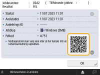 När en rutkod visas i ett detaljfönster i en fellogg kan du scanna rutkoden med en mobil enhet, som en mobil eller surfplatta, för att komma åt en sida i Användarhandbok för den här maskinen där du kan läsa mer om hur du hanterar felet.