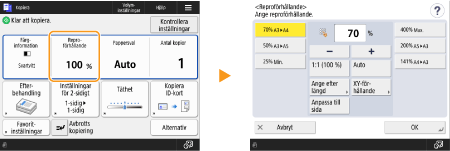 Inställningsstatusen, som kopieringsproportioner, kopieringspapper och antal kopior, visas. När du vill ändra en inställning väljer du önskad inställning.