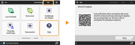 Om du trycker på <Hjälp>visas en rutkod. Om du scannar den här rutkoden med en mobil enhet, som en mobil eller surfplatta, kan du komma åt sidan Användarhandbok för den här maskinen.
