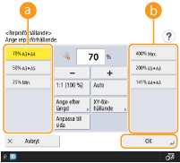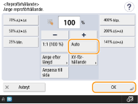 Om du väljer <Auto> måste du välja pappersformatet manuellt. Om du inte väljer något pappersformat anges reproförhållandet automatiskt så att det passar det papper som har fyllts på i papperslåda 1.
