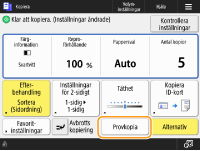 Beroende på antalet kopior och inställningar, visas <Provsats> som du kan använda för att kontrollera kopieringsresultatet genom att skriva ut en provkopia. Kontrollera kopieringsresultatet