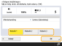 Återkalla tidigare använda kopieringsinställningar (Tidigare inställningar)