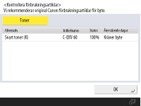 Även om <Kräver byte> visas i <Återstående dagar> ska du inte byta förrän ett meddelande visas i statusvisningsområdet som uppmanar dig att byta förbrukningsartiklar (längst ner på pekskärmen).