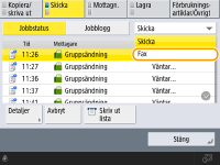 Tryck på (Stopp) om det finns flera sändjobb på skärmen när du ska välja vilket jobb som ska avbrytas. Om sändjobbet du vill avbryta inte visas trycker du på <Kontrollera andra jobb> för att visa <Sändjobb>. Välj det jobb som ska avbrytas och tryck på <Avbryt>.