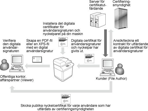 Den nyckel och det certifikat (användarcertifikat) som krävs för att lägga till en användarsignatur kan registreras via Remote UI (Fjärranvändargränssnittet). Utse en administratörer som registrerar dessa alternativ. När de har registrerats, kan användare som loggar in med personlig autentisering lägga till en digital signatur i dokument som skickas i ett visst filformat. Lägga till en digital signatur