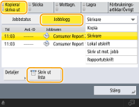(Statusmonitor) visas skärmen Statusmonitor, som låter dig kontrollera användningshistoriken för varje funktion, t.ex. kopiera, skriva ut, skicka e-post, skicka/ta emot fax/I-fax etc. På den här skärmen kan du även skriva ut användningshistoriken för varje funktion.