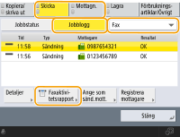 Du kan inte konfigurera inställningarna för faxaktivitetsrapport om <Visa jobblogg> i <Hanteringsinställningar> har satts till <Av>. Dessutom, om du ändrar <Visa jobblogg> i <Hanteringsinställningar> från <Av> till <På>, ändras automatiskt <Skriv ut/skicka för varje angivet ant. överför.> och <Skriv ut/skicka vid angiven tid> i faxaktivitetsrapport till <Av>. <Visa jobblogg>