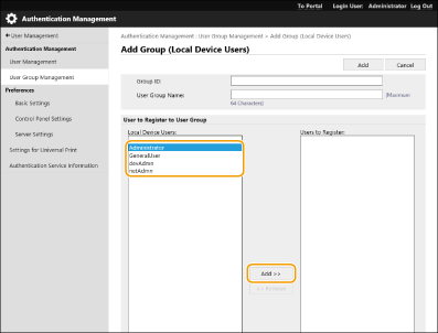 Klicka på [Användarhantering]  [Hantera autentisering]  [Hantering av användargrupp].