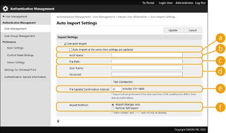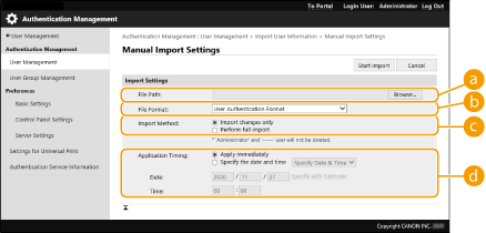När du utför en fullständig import tas alla användare bort från maskinen som inte finns i importerade filer. Men "-----" och "Administrator", som har registrerats som standard, blir kvar även om de inte visas i de importerade filerna.