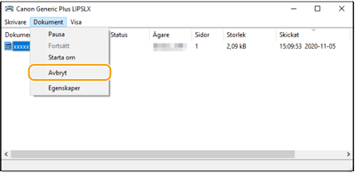 Välj det dokument du vill avbryta och klicka på [Document]  [Cancel].
