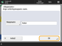 Om den angivna mappen redan finns sparas det scannade dokumentet i den mappen. Om den angivna mappen inte finns skapas en mapp med det angivna namnet och det scannade dokumentet sparas i den skapade mappen.