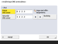 Tryck på <Preferenser>  <Nätverk>  <Inställningar underlinje>  <Inställningar för systemdatakommunikation>  <DNS-serveradress - inställningar>.