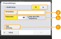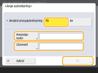 Tryck här för att ställa in autentiseringsinformationen när du använder autentiseringsfunktionen för en proxyserver. Tryck på <På> på skärmen som visas, ange användarnamn och lösenord för proxyautentisering och tryck på <OK>.