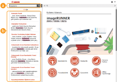 Belirtilen anahtar sözcükleri içeren sayfaların arama sonuçlarını görüntüler. Bu sonuçlardan, aradığınız sayfayı belirleyin ve sayfanın konu başlığına tıklayın.