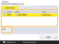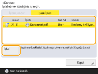 (Durdur) seçeneğine basarsanız ve <İşleri Gönder>/<Baskı İşleri> seçeneğine yönlendiren bir ekran görüntülenirse, devam eden gönderme/yazdırma işi duraklatılır ve <İşleri Gönder>/<Baskı İşleri> görünür.