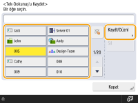 LDAP sunucusu makineye zaten kaydedilmişse (LDAP Sunucusunu Kaydetme) hedefleri arayabilir ve tek dokunuş düğmelerine kaydedebilirsiniz. <Hedf/İlt Ayarları>  <Tek-Tuşu Kaydet> , kaydetmek istediğiniz tek dokunuş düğmesini seçin , <Kaydet/Düzenle>  <LDAP Sunucusu> seçeneğine basın ve <Koşula Göre Ara> seçeneğini kullanarak hedefleri arayın. Hedefin ayarlarını doğruladıktan sonra <Tek-Tuş Adı>  seçeneğine basın, görüntülenecek tek dokunuş düğmesinin adını girin  ve <Tamm> seçeneğine basın.