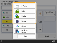 Kaydedilecek hedef türü olarak <Faks>, <E-Posta>, <I-Faks> veya <Dosya> öğesini seçin. Adres Defterine Hedef Kaydetme