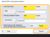 <Kişisel SSID ve Ağ Anahtarı Ayarları> seçeneğine basın, kişisel bir SSID ve anahtarı belirtip <Tamm> seçeneğine basın.