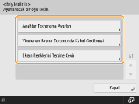 Ekranda görüntülenen klavye ile ikinci bir tuşa basılmasını kabul etmek için beklenecek süreyi ayarlamak için <Yinelenen Basma Durumunda Kabul Gecikmesi> öğesine basabilirsiniz. Bu, istenmeyen tuş girişlerin önlemenizi sağlar.