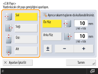 Zımbalama veya delgeç izleri için ciltleme kenarlıkları oluşturabilirsiniz. Ciltleme kenarlıklarını sayfanın ön yüzünde ve arka yüzünde ayrı ayrı ayarlayabilirsiniz.