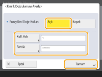 Proxy sunucusu kimlik doğrulama fonksiyonunu kullanmak için bu düğmeye basıp kimlik doğrulama fonksiyonunu yapılandırın. Gösterilen ekranda <Açık> düğmesine basın, proxy kimlik doğrulaması için kullanılacak kullanıcı adı ile parolayı girin ve <Tamm> seçeneğine basın.