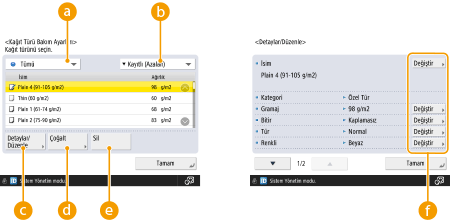 Özel kağıt tiplerini kaydetmek veya kayıtlı özel kağıt tiplerinin ayarlarını değiştirmek için yönetici olarak oturum açmanız gereklidir. Makinede Oturum Açma