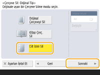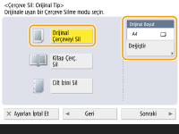 <Orijinal Boyut> bölümünde gösterilen boyut kitabın boyutundan farklıysa, boyutu seçmek için <Değiştir> seçeneğine basın. Yalnızca dokunmatik panel ekranda gösterilen orijinal boyutları taranabilir.