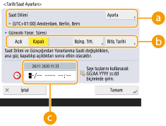 <Saat Dilimi> veya <Günışığı Yarar. Süresi> ayarını değiştirdiyseniz gücü kapatarak makineyi yeniden başlatmanız gerekir. Makineyi KAPATMAK için güç anahtarına basın ( Makineyi Kapatma). Dokunmatik panel ekranı ve göstergeleri kapandıktan sonra en az 10 saniye geçtiğinde makineyi tekrar AÇIN ( Makineyi Açma).