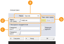 Укажіть, чи надсилати інтернет-факси адресатам через поштовий сервер. Виберіть значення <Увімк.>, якщо потрібно надсилати інтернет-факси через поштовий сервер. Виберіть значення <Вимк.>, якщо потрібно надсилати дані безпосередньо адресату в одній локальній мережі (LAN). Надсилаючи дані безпосередньо отримувачу, ви можете надсилати великі обсяги даних, не перевантажуючи поштовий сервер.