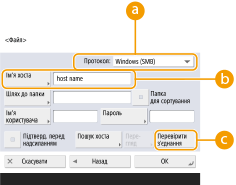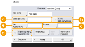 Якщо вибрати пункт <Windows (SMB)>, відобразяться кнопки <Пошук хоста> і <Перегляд>. Ви можете легко вказати файловий сервер/Розширений простір, виконавши пошук у мережі чи переглянувши мережу.