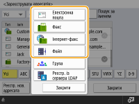 Ви можете зареєструвати номер факсу чи адресу електронної пошти отримувача, які можна використовувати під час надсилання сканованих документів в адресну книгу. Як адресата в адресній книзі також можна зареєструвати адресата інтернет-факсів, розташування папки файлового сервера (IP-адресу та шлях) і сховище (Розширений простір) багатофункціонального принтера Canon.