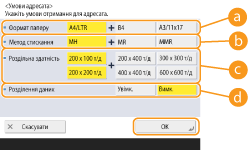Встановіть умови адресата відповідно до характеристик апарата одержувача. Якщо формат паперу даних, які ви надсилаєте, більший за формати, які можна використовувати з пристроєм отримувача, зображення може бути обрізано.