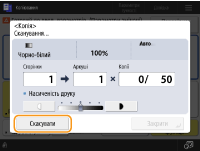 (Стоп) на панелі керування, коли відображається екран основних функцій копіювання, завдання копіювання призупиняється та з’являється повідомлення <СтопВиберіть завдання копіювання, яке потрібно скасувати.> і список завдань копіювання. Можна вибрати завдання копіювання в списку та скасувати завдання, натиснувши кнопку <Скасувати>.Якщо ввійти за допомогою керування персональною автентифікацією і вийти, натиснувши кнопку
